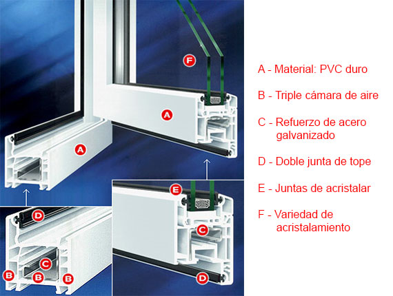Marcos y hojas llevan refuerzos internos, son plegados de acero galvanizado con las dimensiones y momentos de inercia necesarios para otorgarle a los perfiles de PVC un alto grado de resistencia.