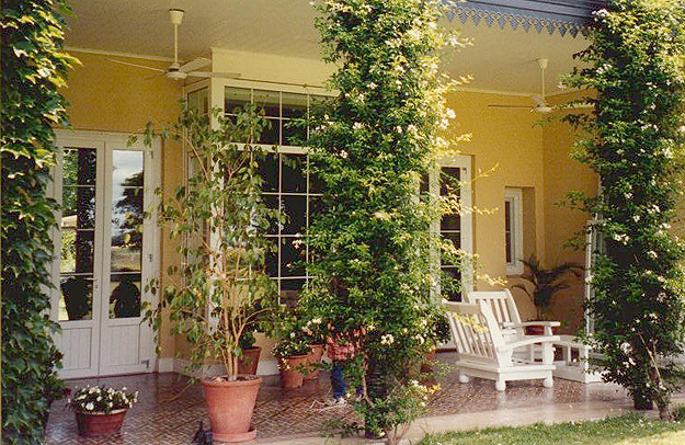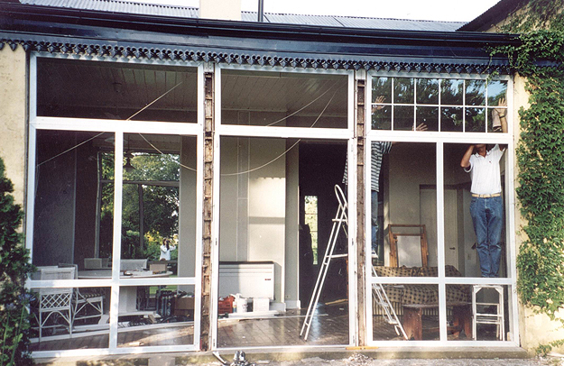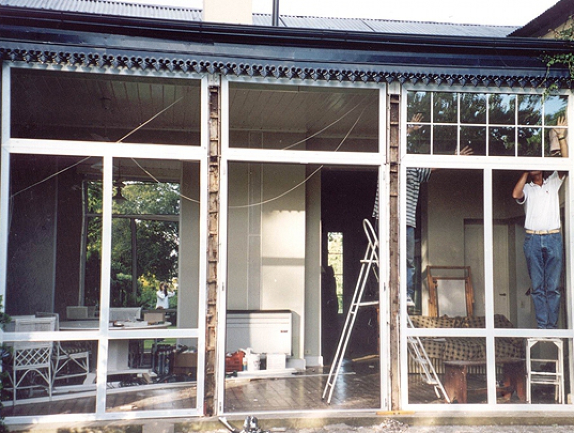 Tomamos el trabajo de reciclar las carpinterías en una casa de campo centenaria, la misma tiene un cuidado amoblamiento, se utiliza los fines de semana y en periodos de vacaciones, pero el confort que hoy pretendemos de una vivienda esta muy lejos de lo que se podía lograr cuando se construyo. Hicimos una propuesta de renovación sin alterar en nada el espíritu de la casa, respetamos la partición en ventanas bien verticales, los vidrios repartidos y las banderolas superiores.